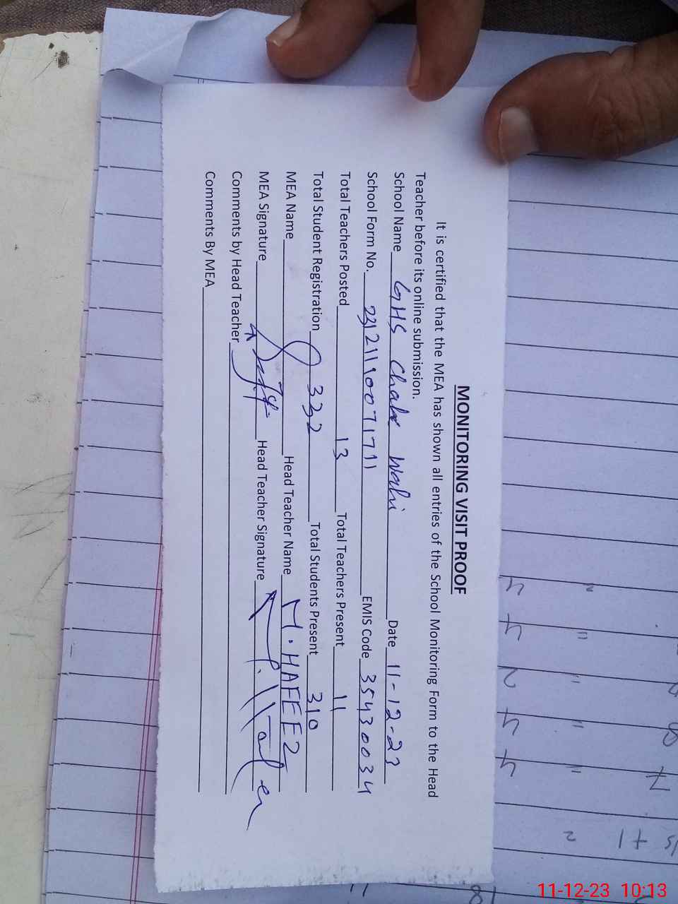 | Attendance Register | Head Teacher | MEA with School | Visit Proof |