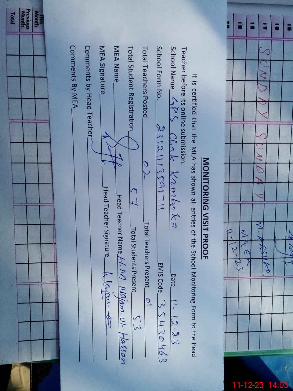 | Attendance Register | Head Teacher | MEA with School | Visit Proof |
