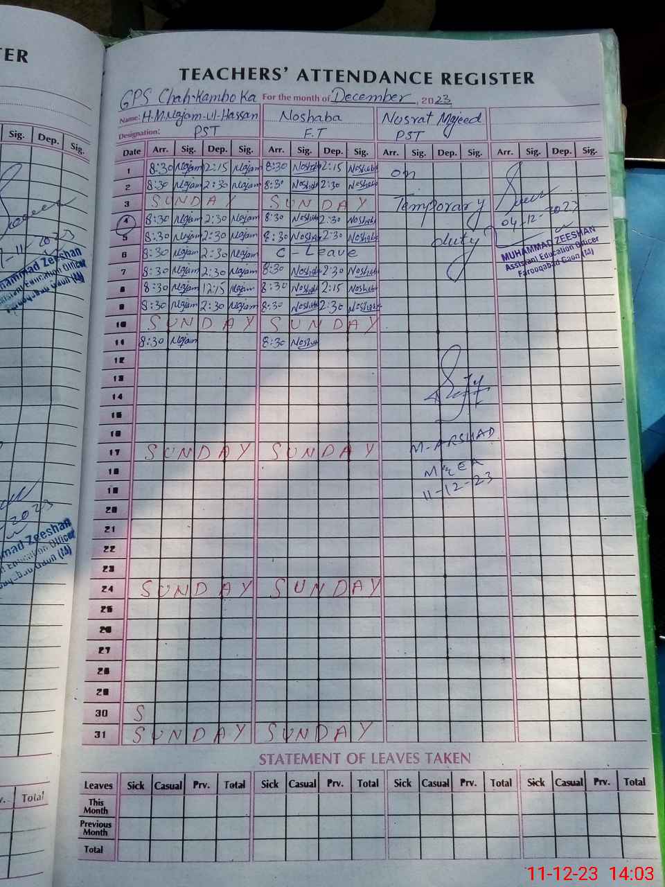 | CNIC | Full Name | Designation | R/C | Absence During Last Calender Month |