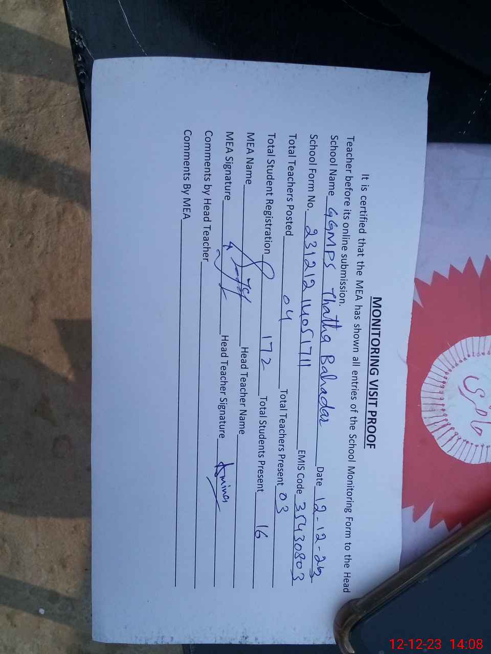 | Attendance Register | Head Teacher | MEA with School | Visit Proof |