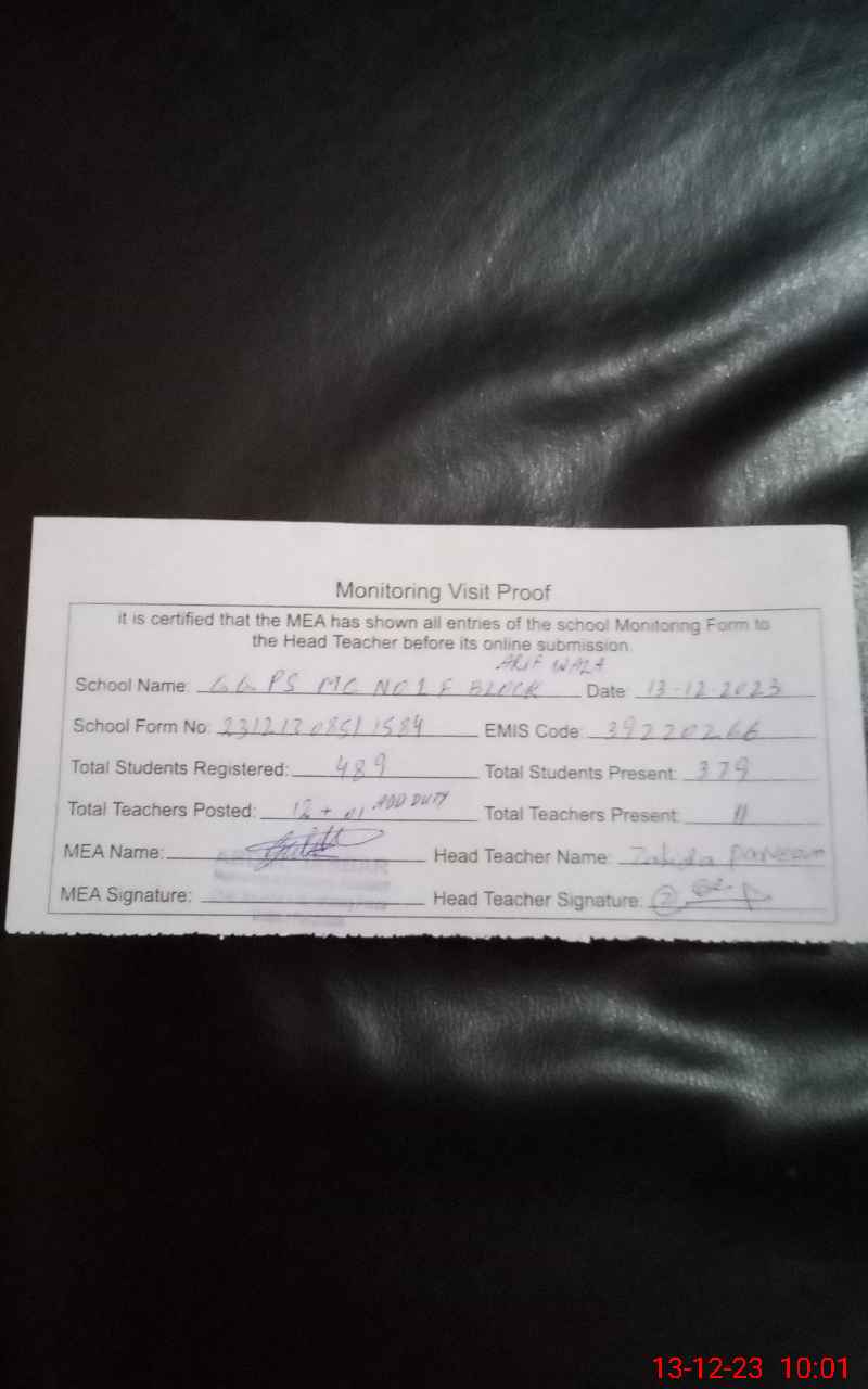 | EMIS Code: 39220266 | Name of School: GGPS MC NO. 1 F BLOCK ARIF WALA | |||