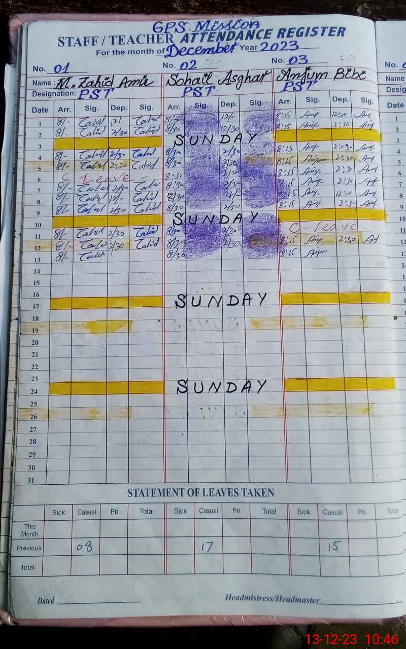| CNIC | Full Name | Designation | R/C | Absence During Last Calender Month |