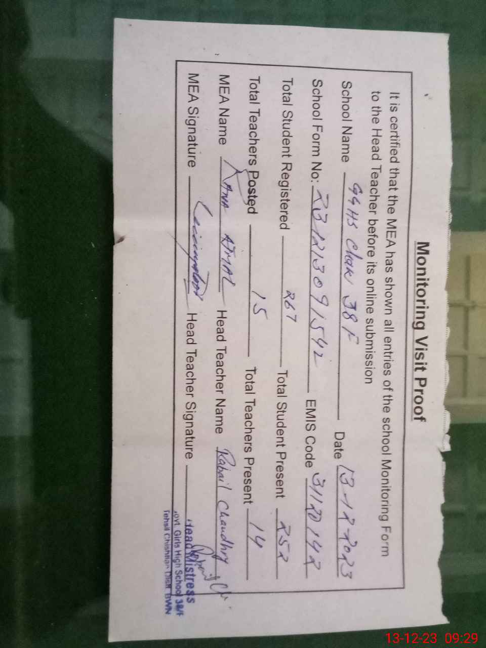 | Attendance Register | Head Teacher | MEA with School | Visit Proof |
