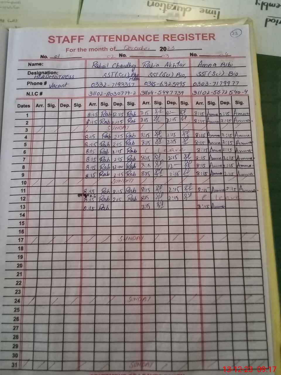 | CNIC | Full Name | Designation | R/C | Absence During Last Calender Month |