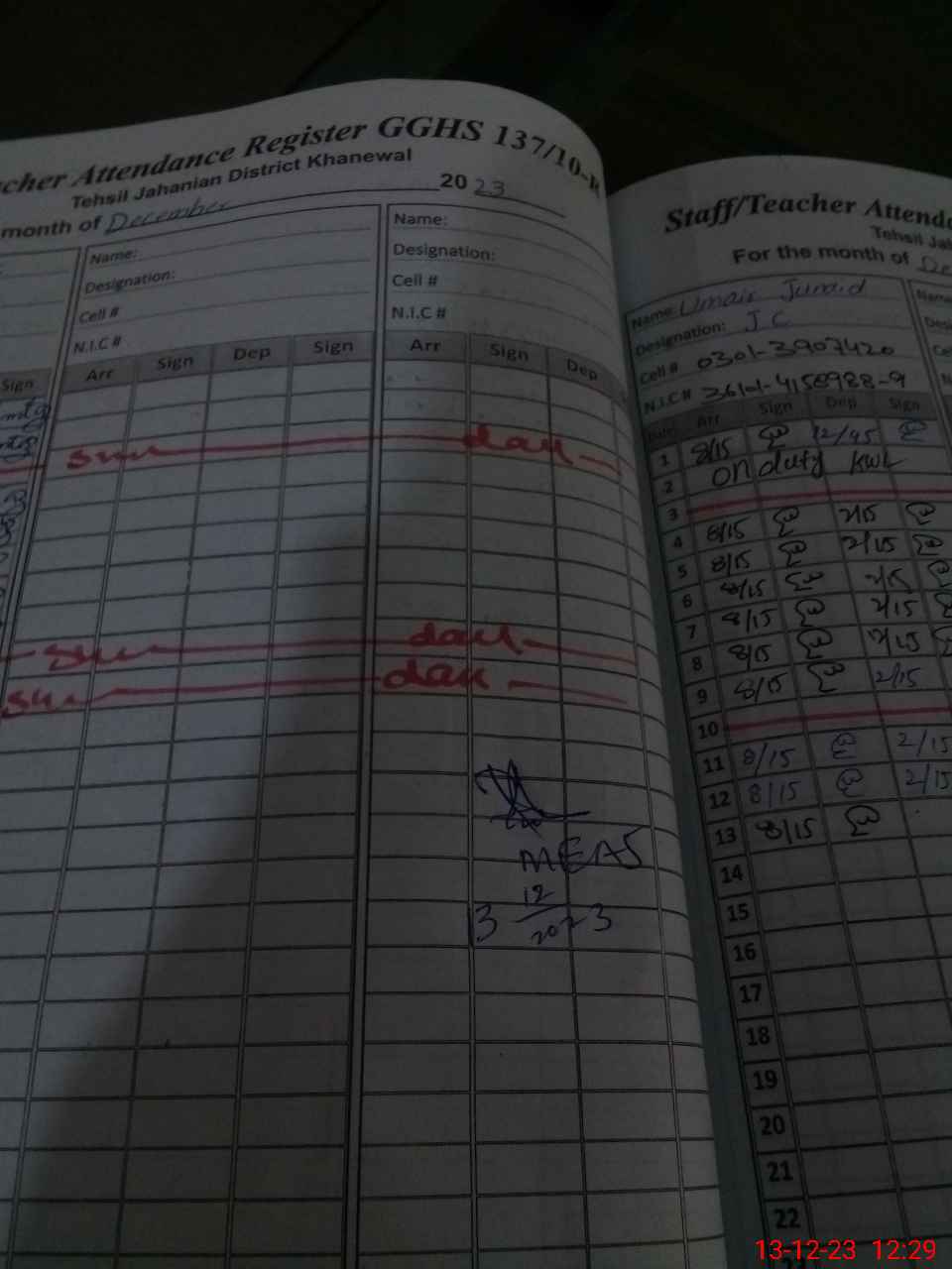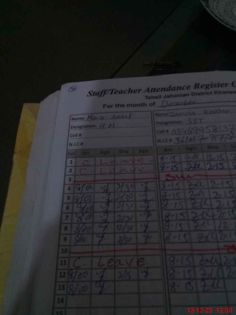 | CNIC | Full Name | Designation | R/C | Absence During Last Calender Month |