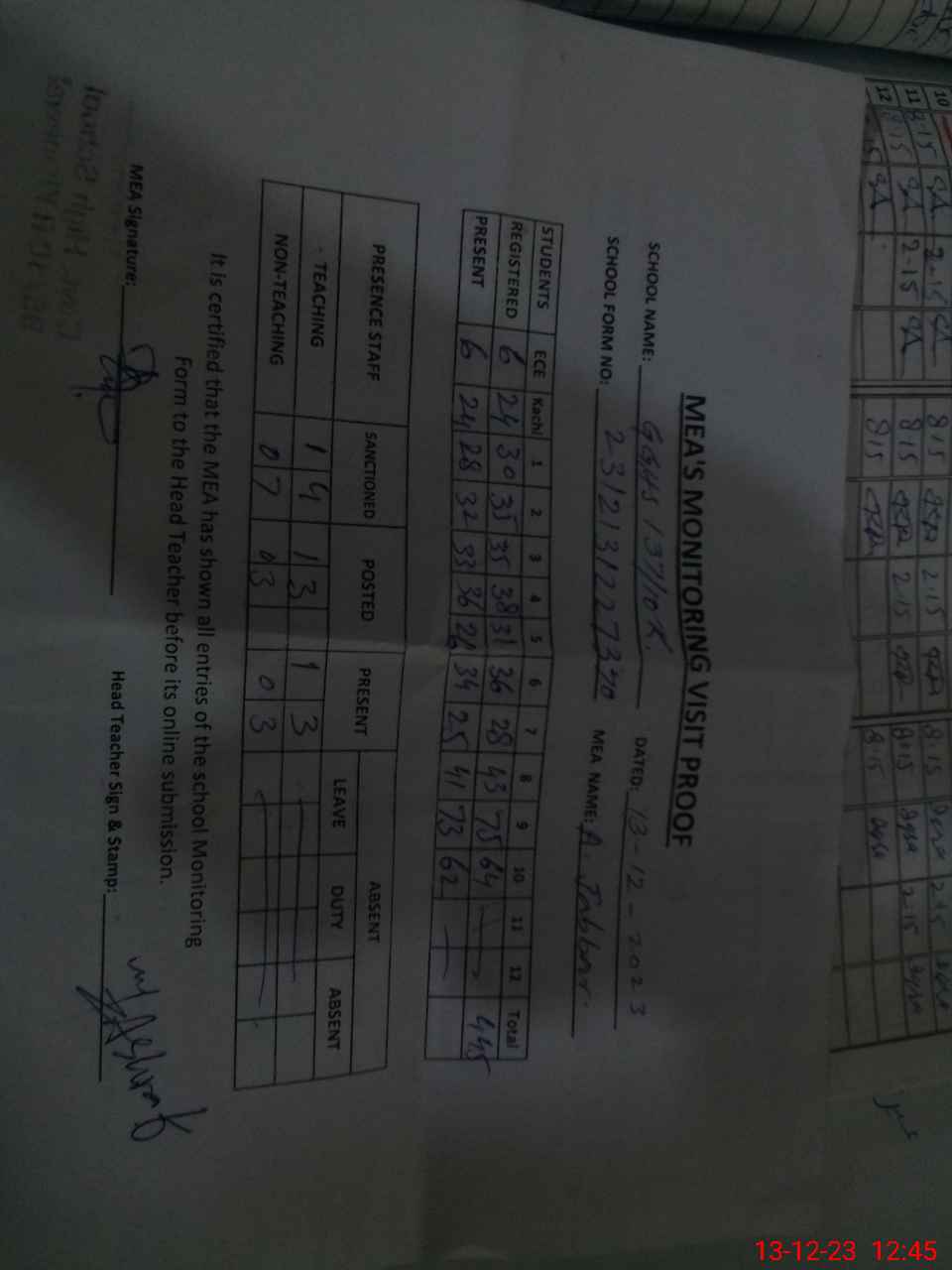 | Attendance Register | Head Teacher | MEA with School | Visit Proof |