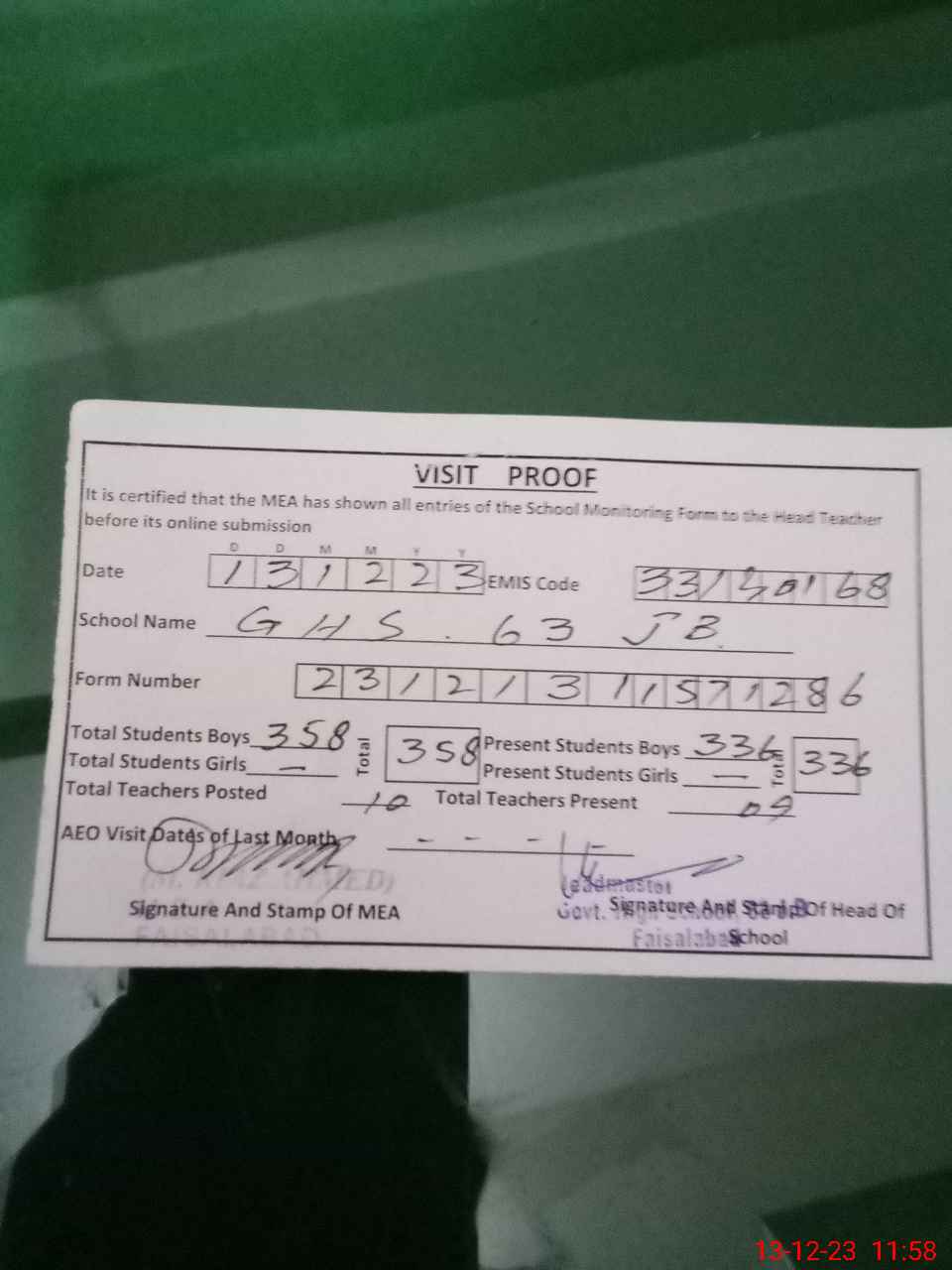 | EMIS Code: 33140168 | Name of School: GHS CHAK 63 JB Faisalabad | |||