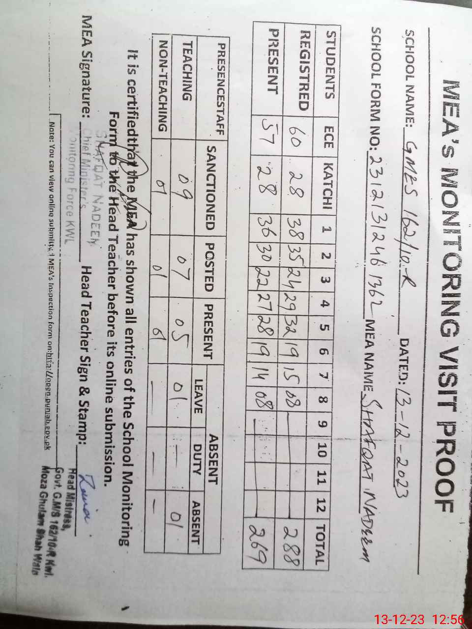 | Attendance Register | Head Teacher | MEA with School | Visit Proof |
