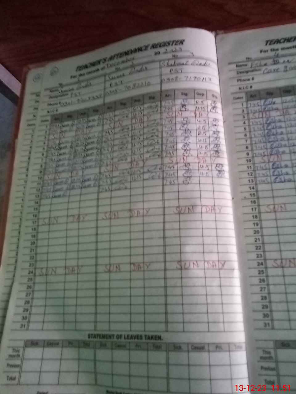 | CNIC | Full Name | Designation | R/C | Absence During Last Calender Month |