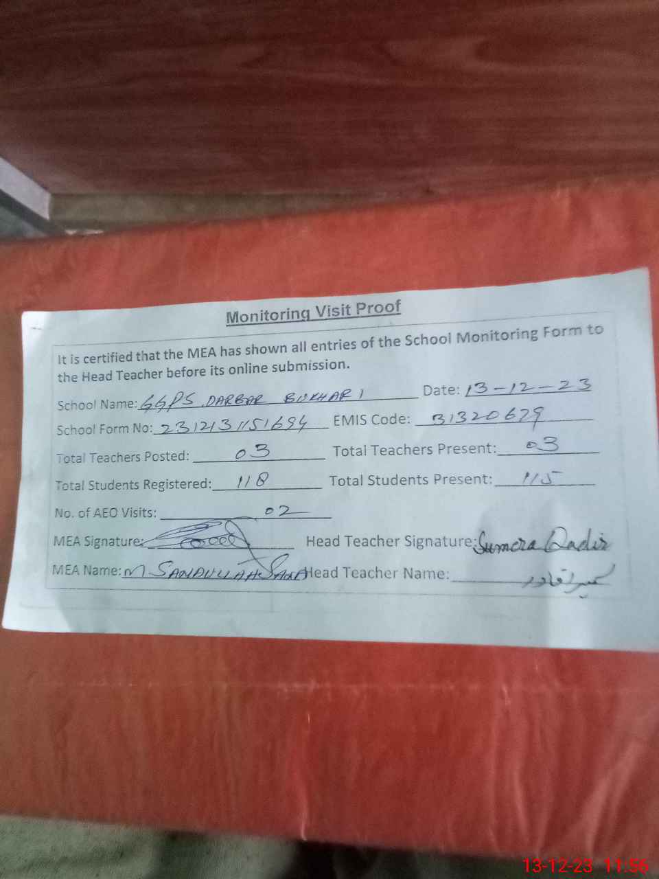 | Attendance Register | Head Teacher | MEA with School | Visit Proof |