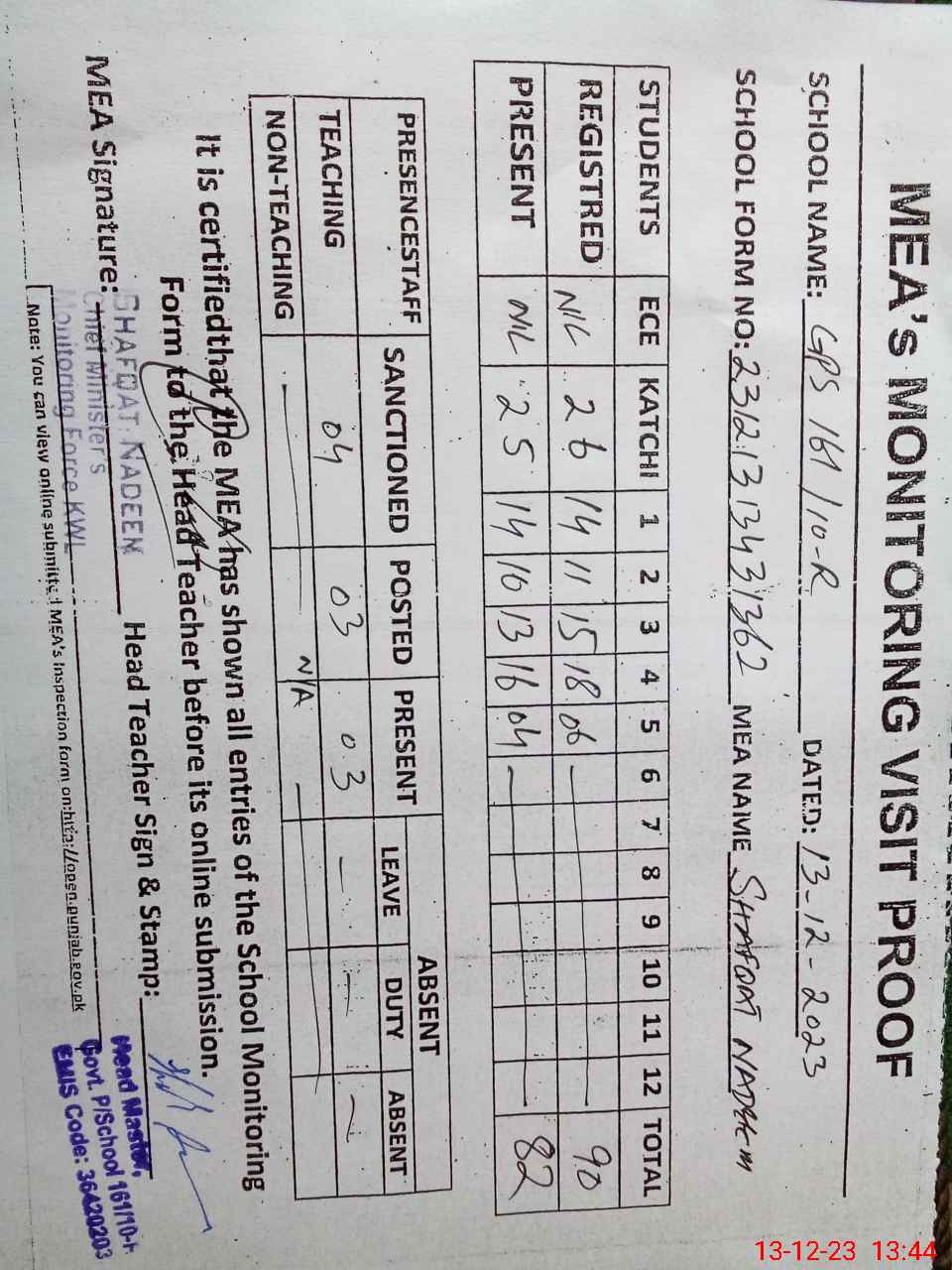 | EMIS Code: 36420203 | Name of School: GPS 161/10-R, KHANEWAL | |||