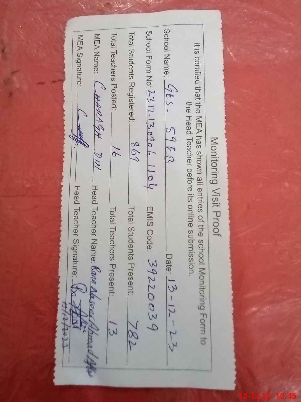 | Attendance Register | Head Teacher | MEA with School | Visit Proof |