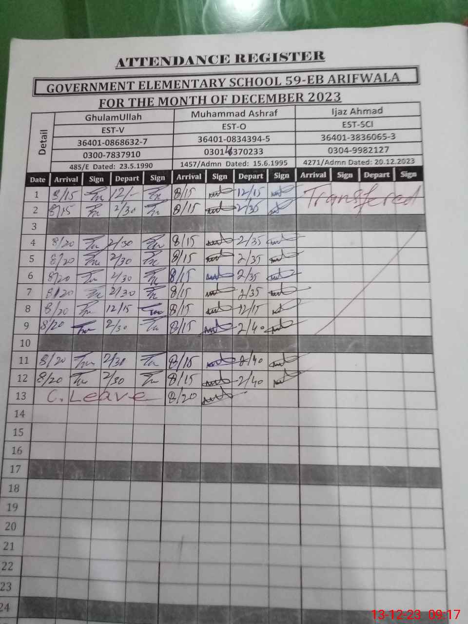 | CNIC | Full Name | Designation | R/C | Absence during last cal. month |
