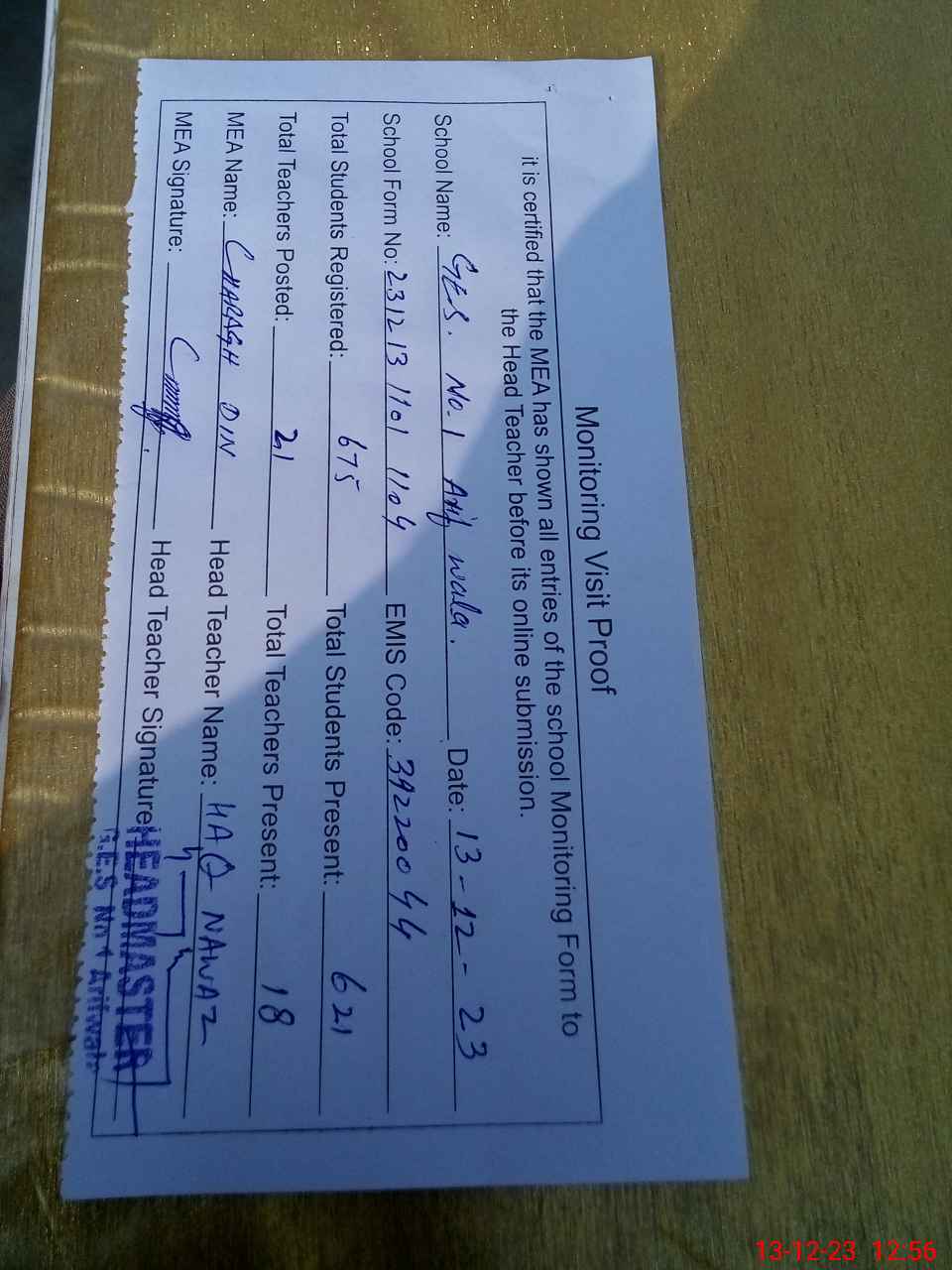 | Attendance Register | Head Teacher | MEA with School | Visit Proof |