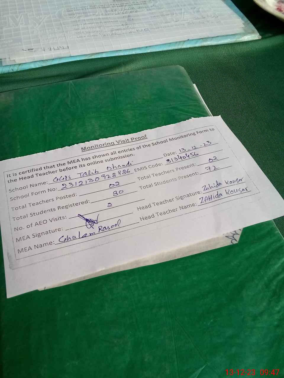| Attendance Register | Head Teacher | MEA with School | Visit Proof |