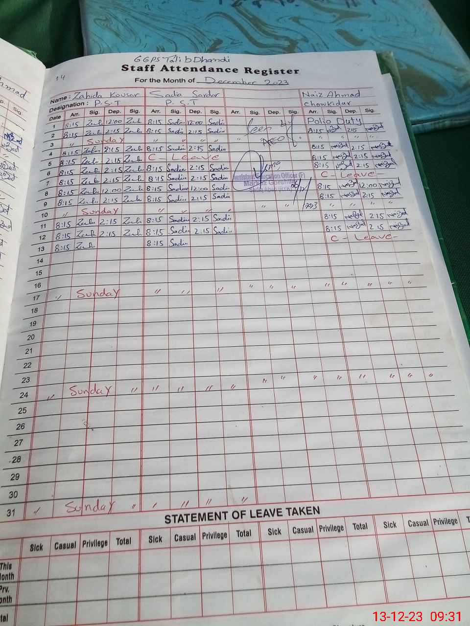 | CNIC | Full Name | Designation | R/C | Absence During Last Calender Month |