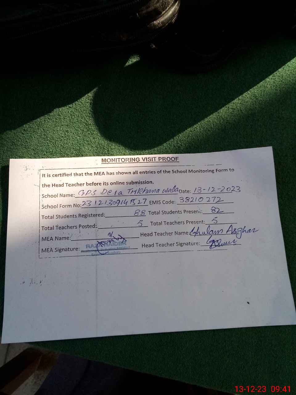 | Attendance Register | Head Teacher | MEA with School | Visit Proof |