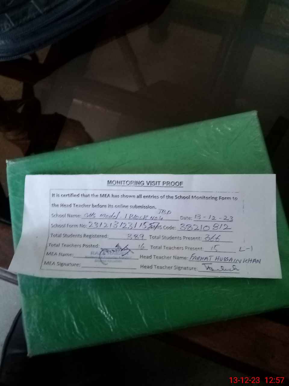 | Attendance Register | Head Teacher | MEA with School | Visit Proof |