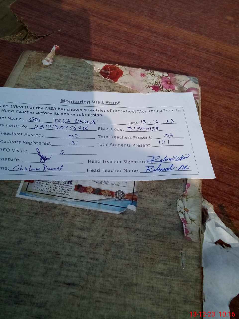 | Attendance Register | Head Teacher | MEA with School | Visit Proof |