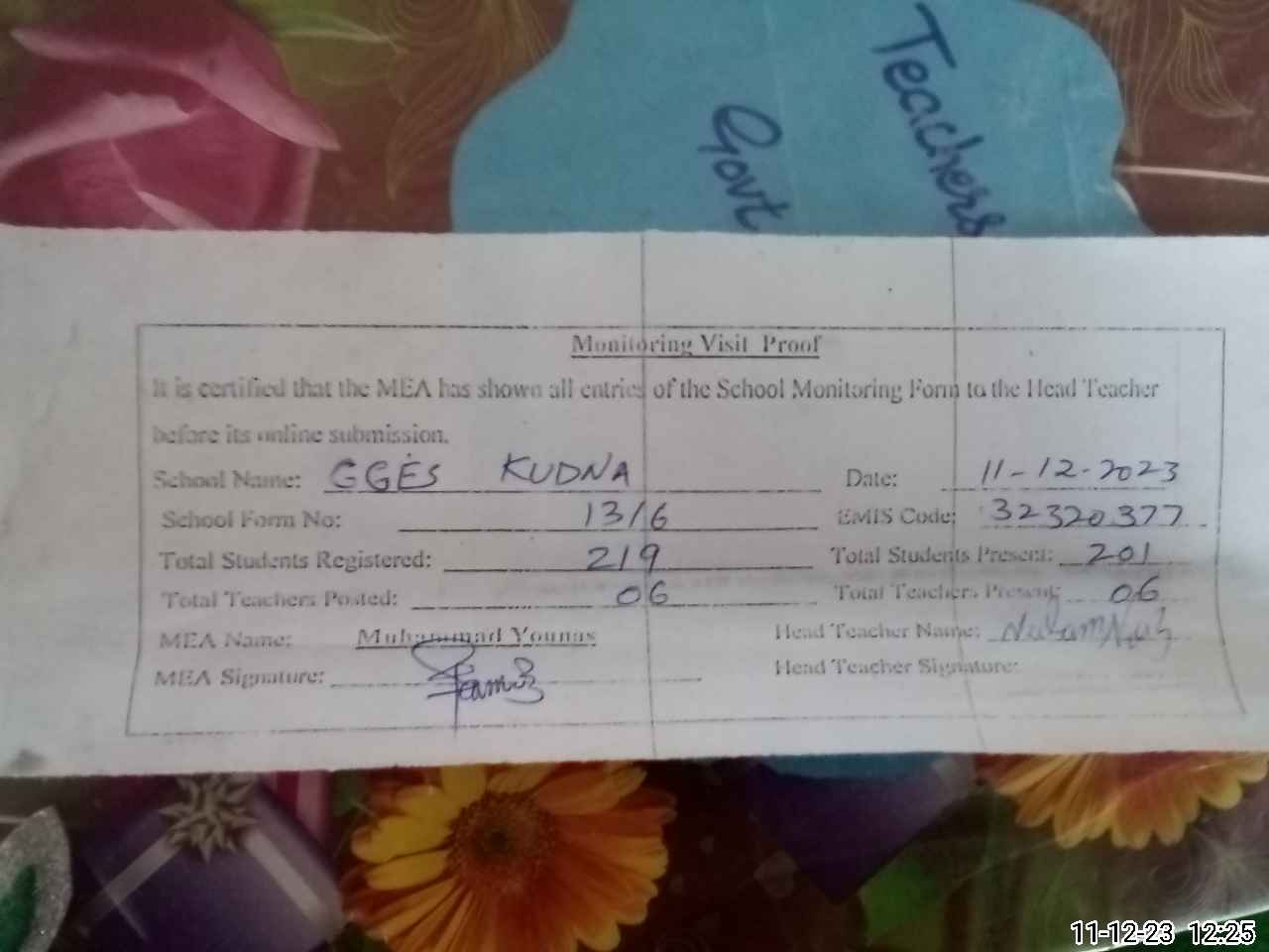 | Attendance Register | Head Teacher | MEA with School | Visit Proof |