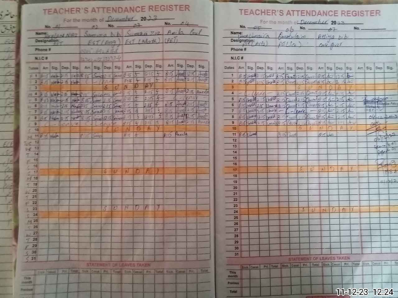 | CNIC | Full Name | Designation | R/C | Absence During Last Calender Month |