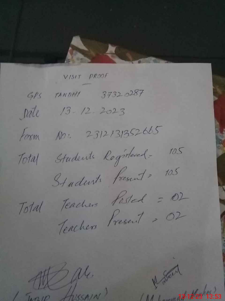 | Total no. of Classrooms: 2 No. of Classrooms Used for Teaching: 2 No. of Classrooms Storing Old Furniture, FTBs, etc: 0Comments if Any: Random class check list not updated in pmiu app NSB last fund received not entered in tablet Boundary wall nil School need more class room two rooms inefficient for 105 students |