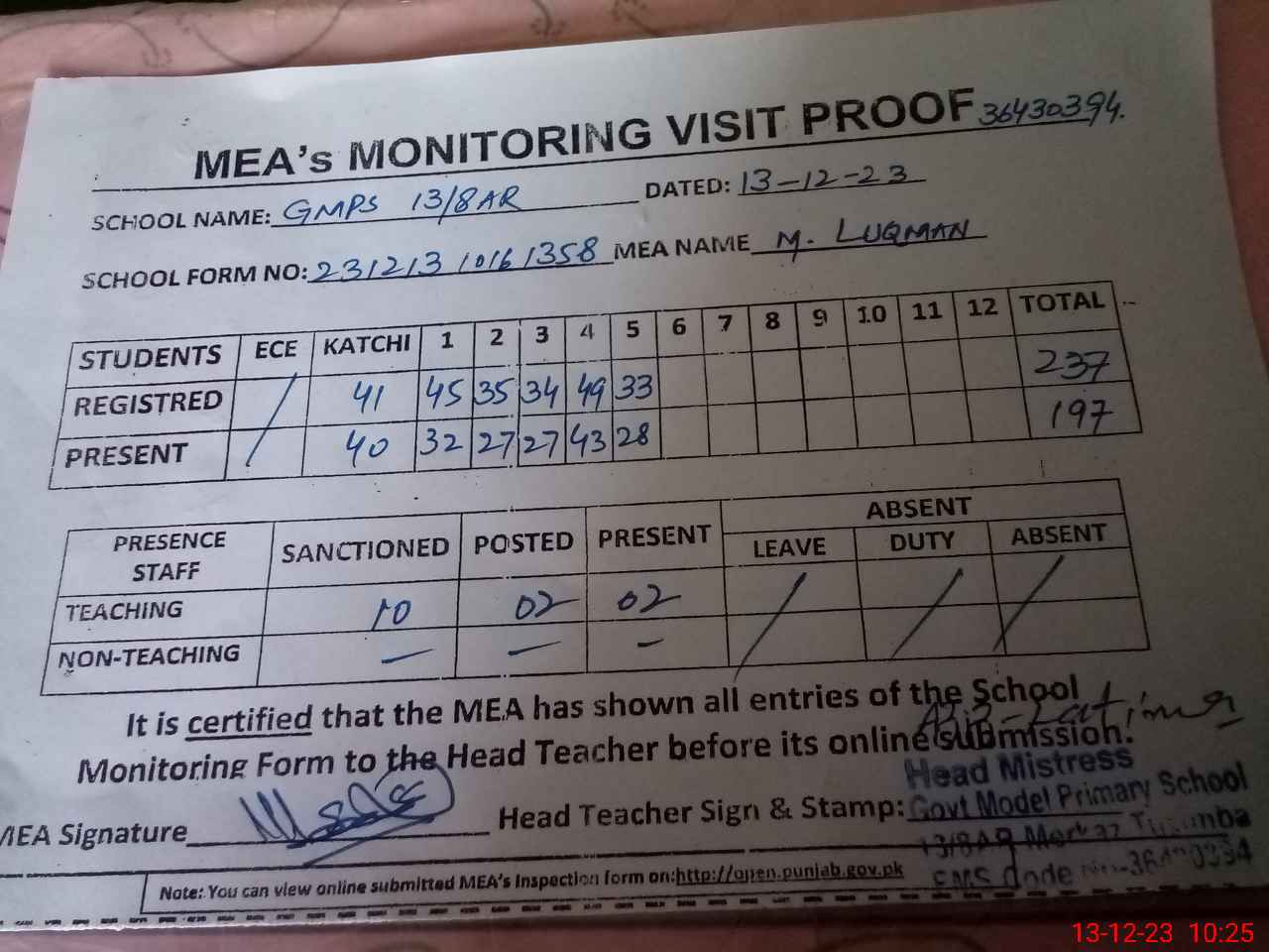 | Certified that this School was Inspected by the Undersigned MEA/DMO Today and the Information Stated Above is as Per Record. | |||||