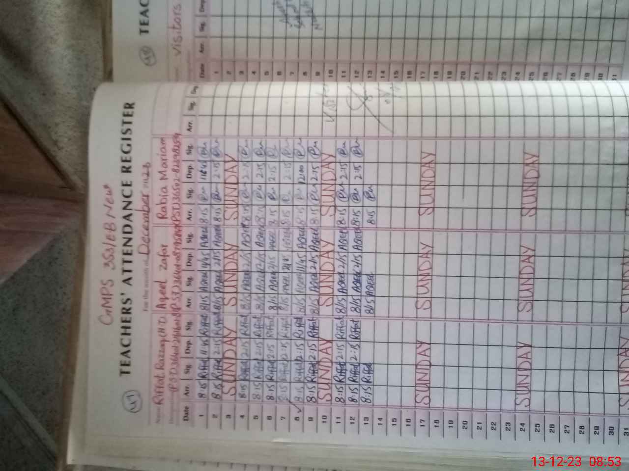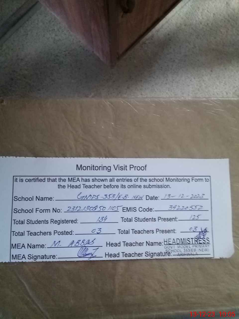 | Attendance Register | Head Teacher | MEA with School | Visit Proof |