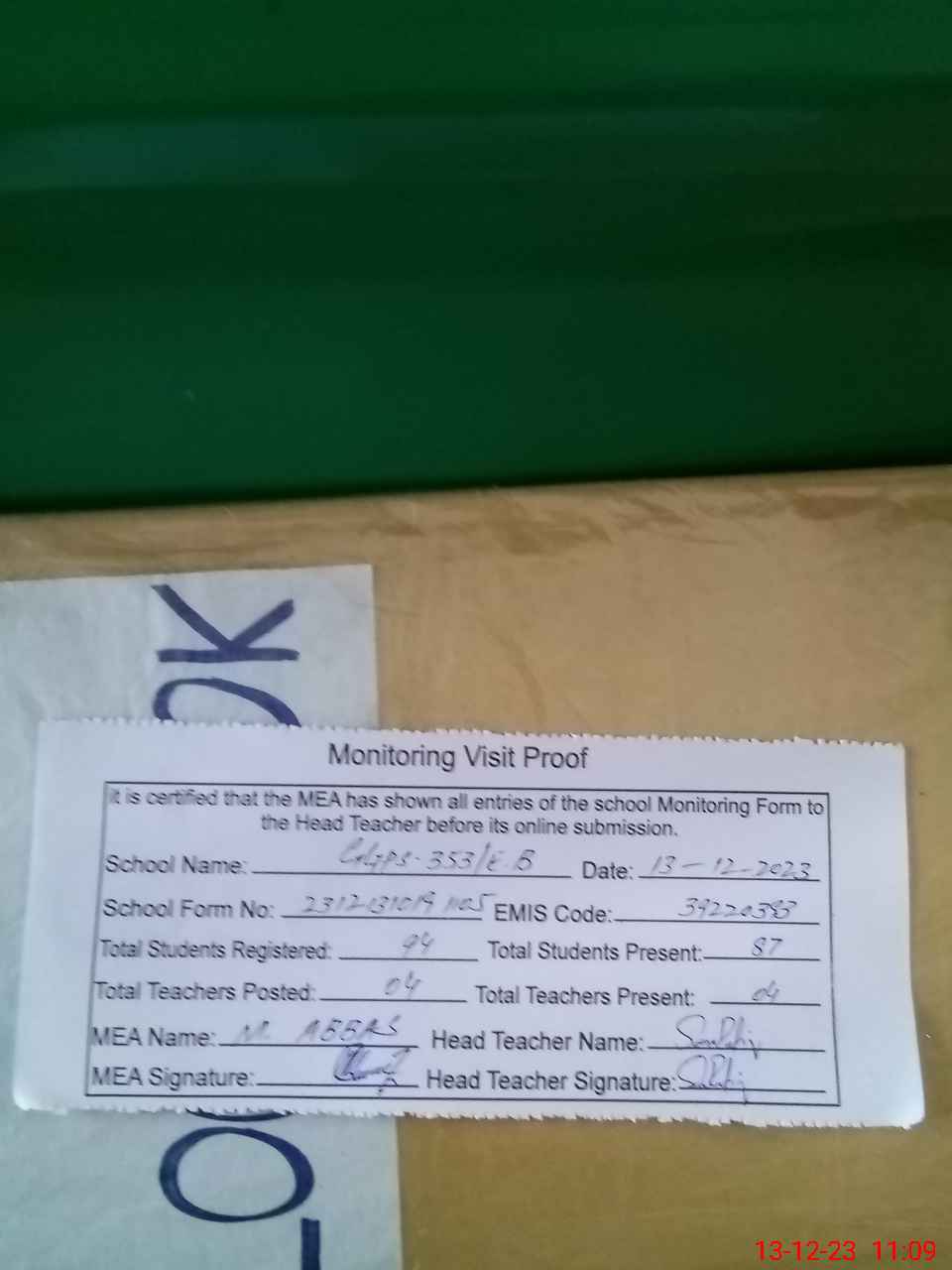 | Attendance Register | Head Teacher | MEA with School | Visit Proof |