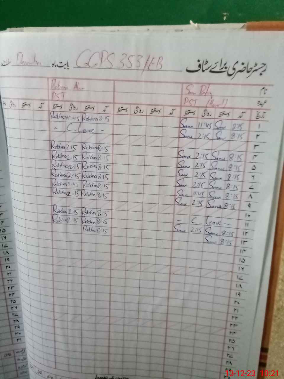 | CNIC | Full Name | Designation | R/C | Absence During Last Calender Month |