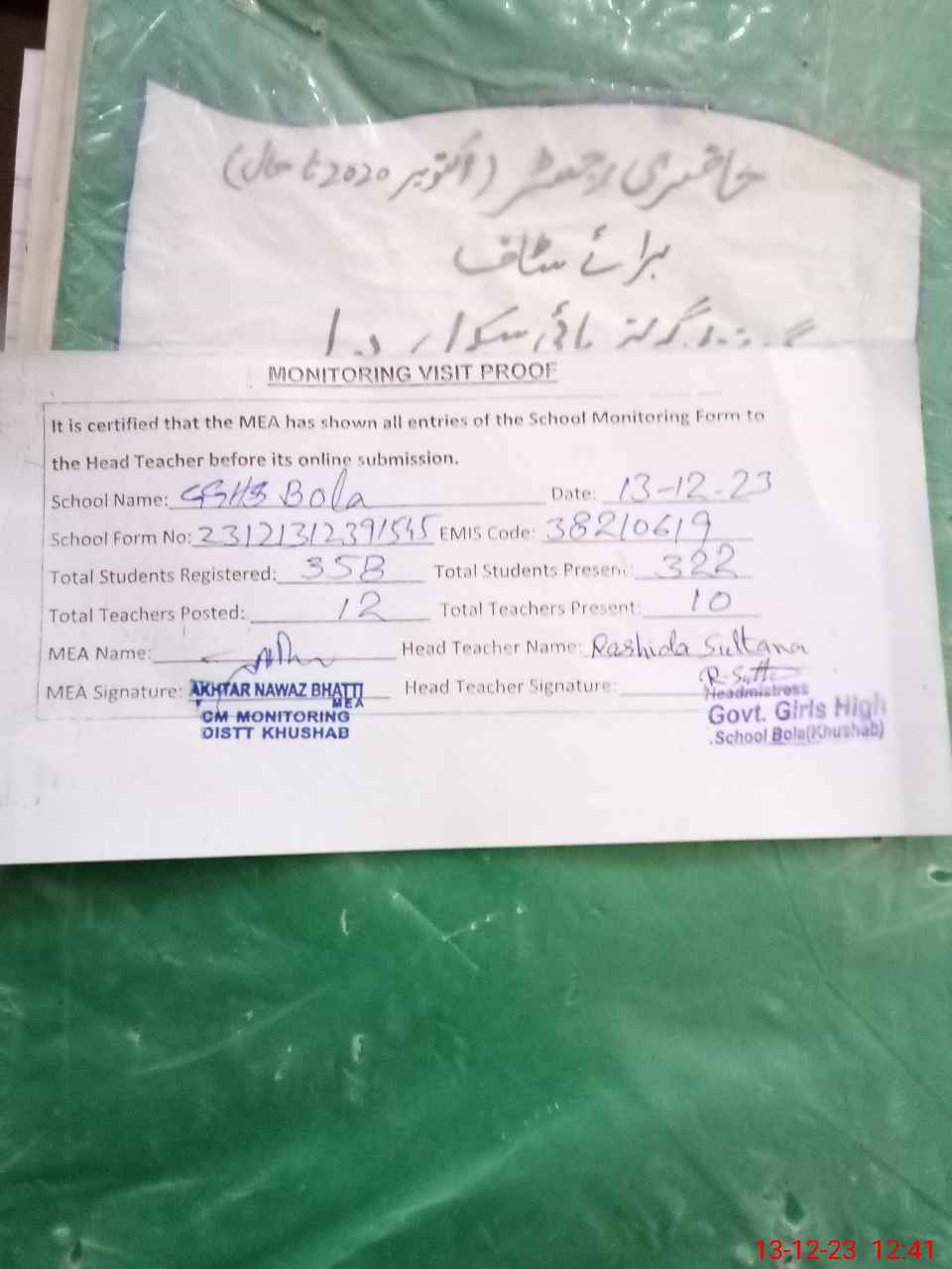 | Attendance Register | Head Teacher | MEA with School | Visit Proof |