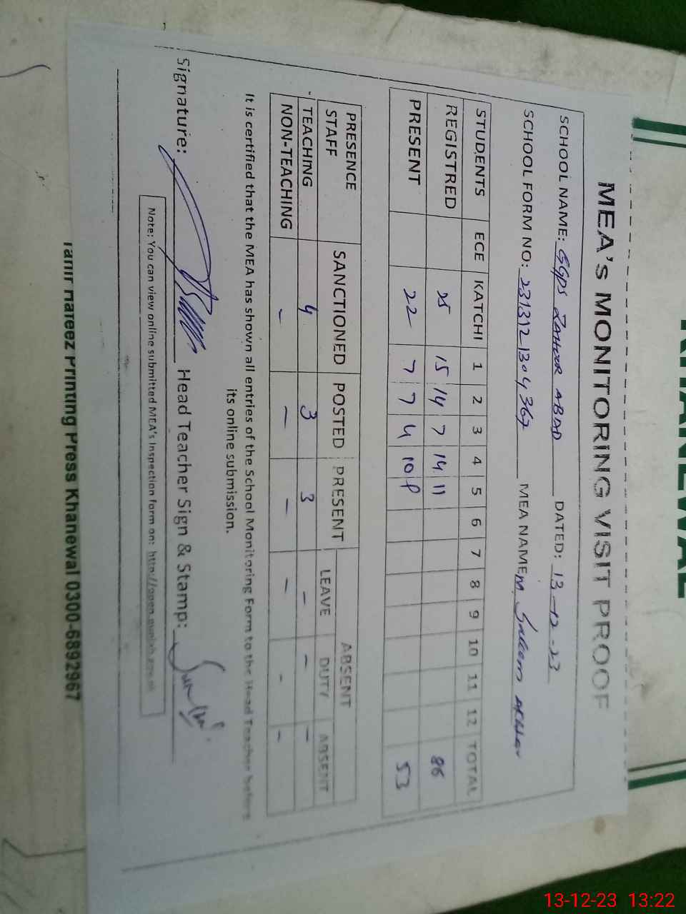 | EMIS Code: 36410391 | Name of School: GGPS ZAHOOR ABAD, KABIRWALA | |||