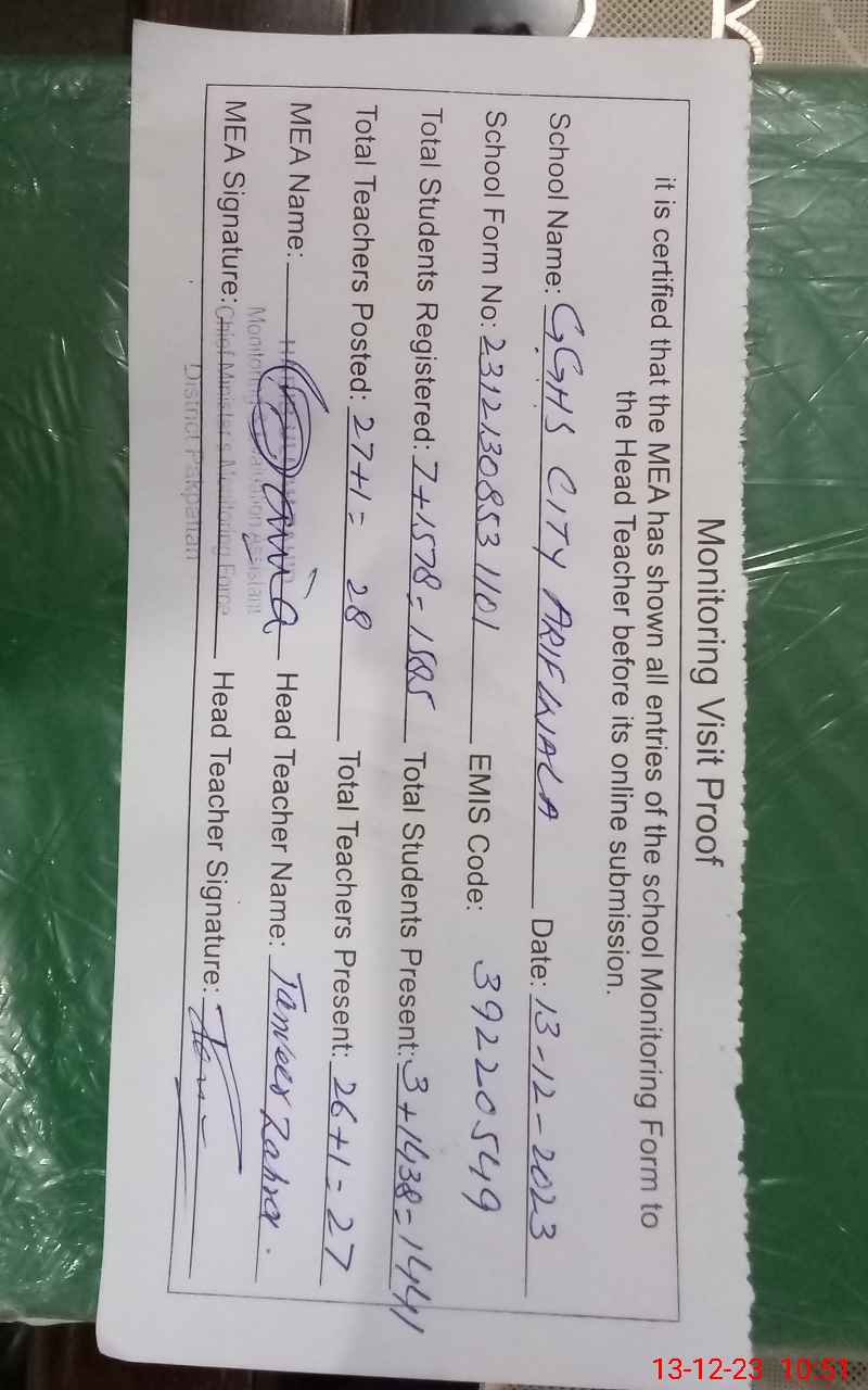 | EMIS Code: 39220549 | Name of School: GGHS CITY ARIFWALA | |||