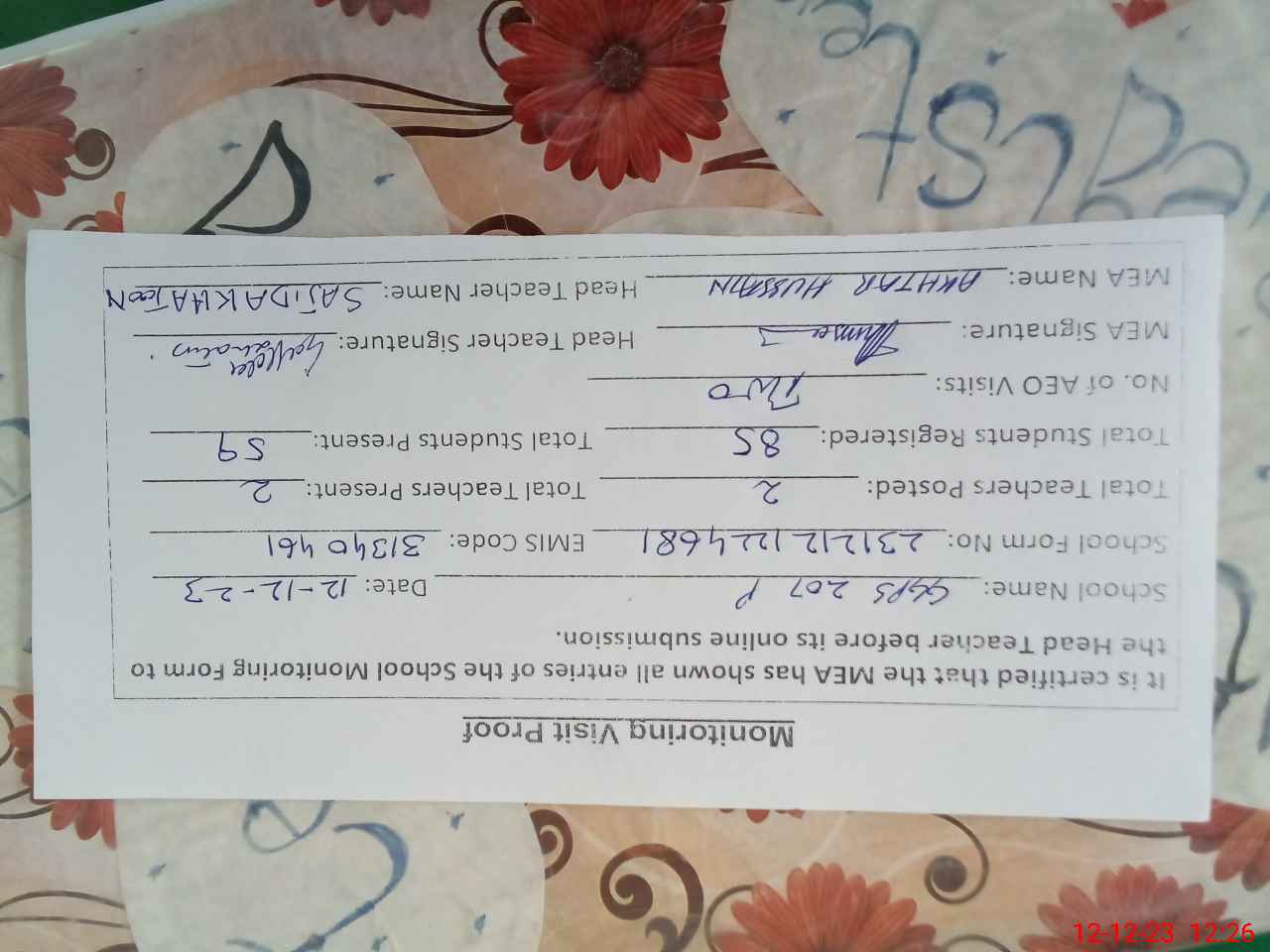 | Attendance Register | Head Teacher | MEA with School | Visit Proof |