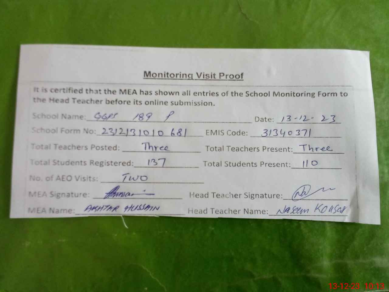 | Attendance Register | Head Teacher | MEA with School | Visit Proof |