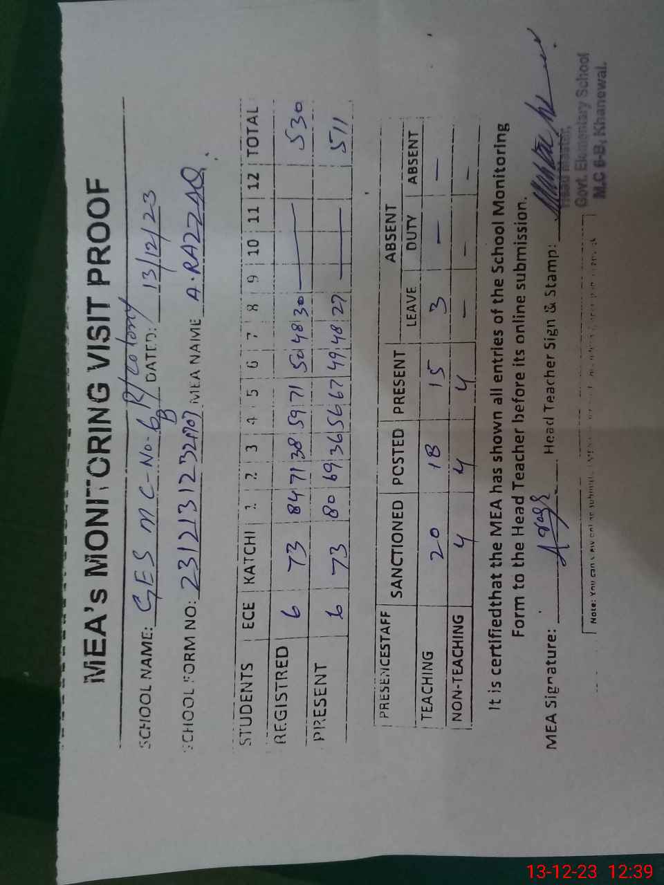 | EMIS Code: 36420061 | Name of School: GES MC NO.6-B, RAILWAY COLONY, KHANEWAL | |||