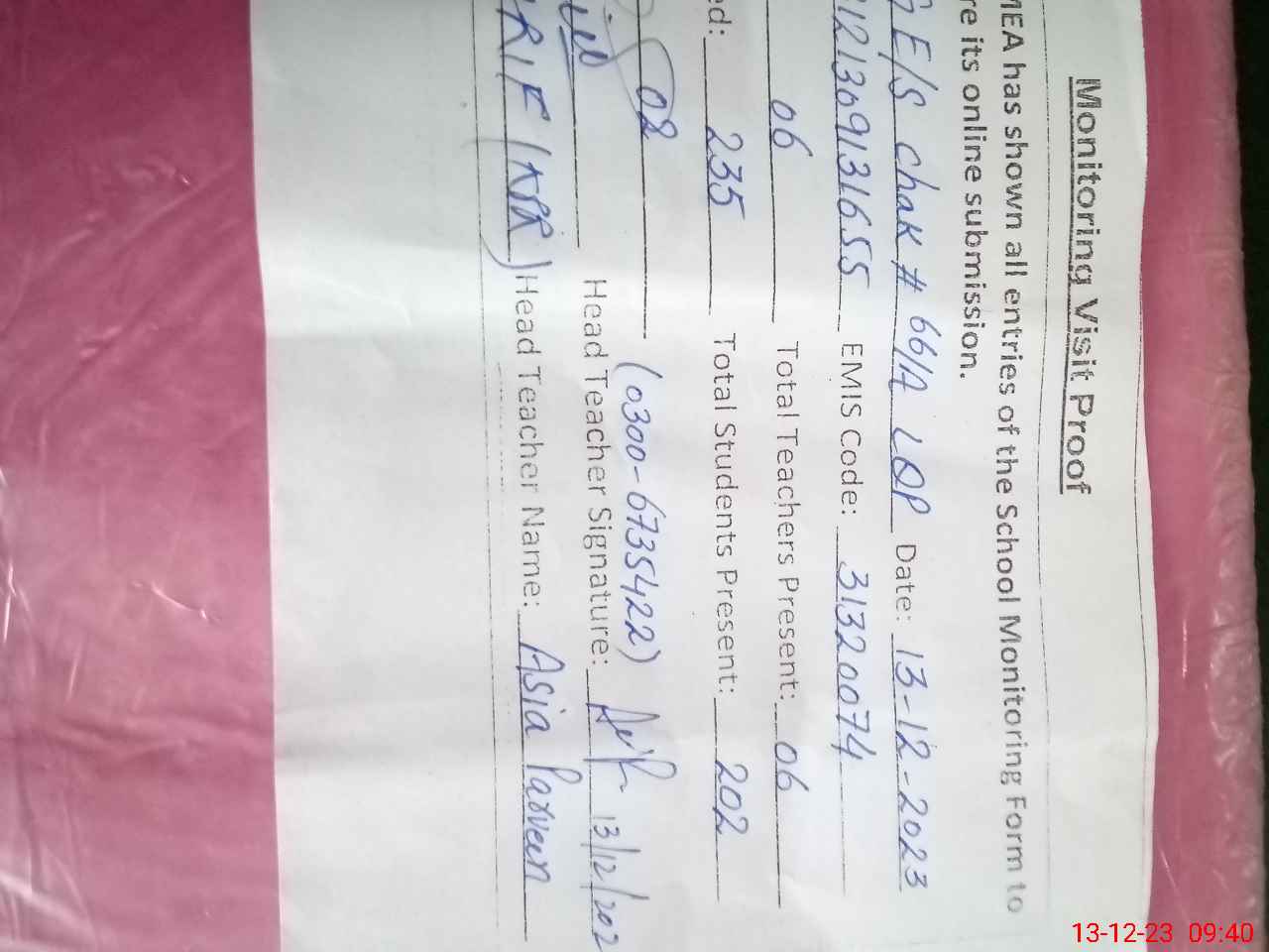 | Name: AA**** PA**** Designation: (School Headmaster's/Headmistress's) SST Phone/Cell Number: 03**** |