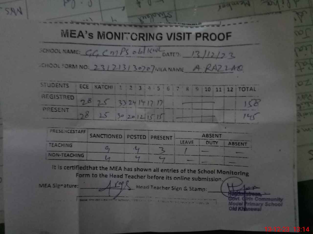 | Attendance Register | Head Teacher | MEA with School | Visit Proof |