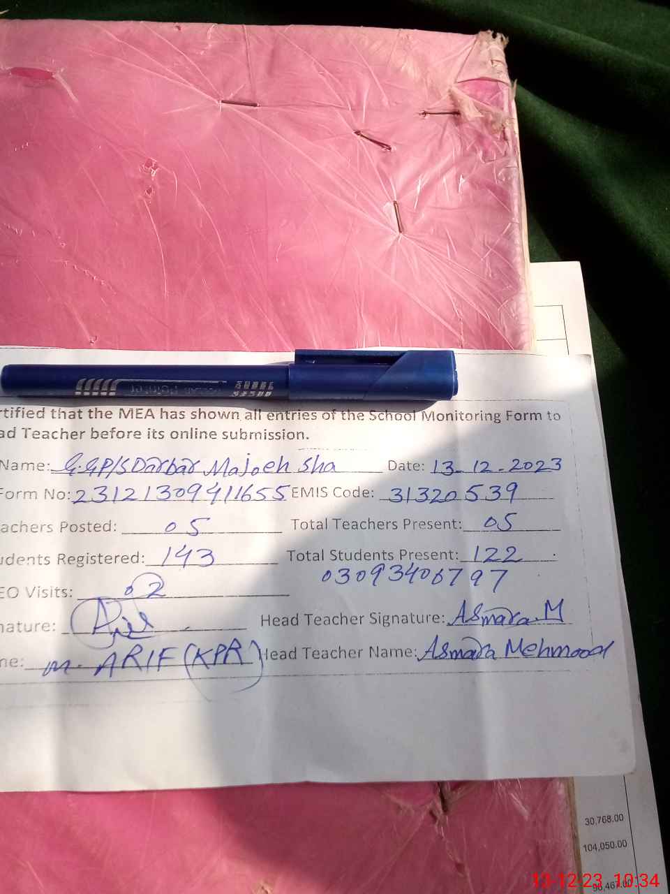 | Name: AS**** ME**** Designation: (School Headmaster's/Headmistress's) PST/PTC/JV Phone/Cell Number: 03**** |