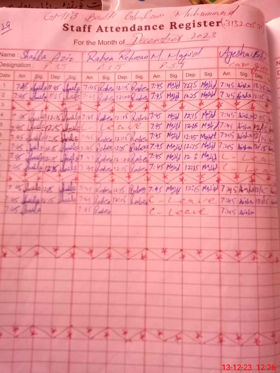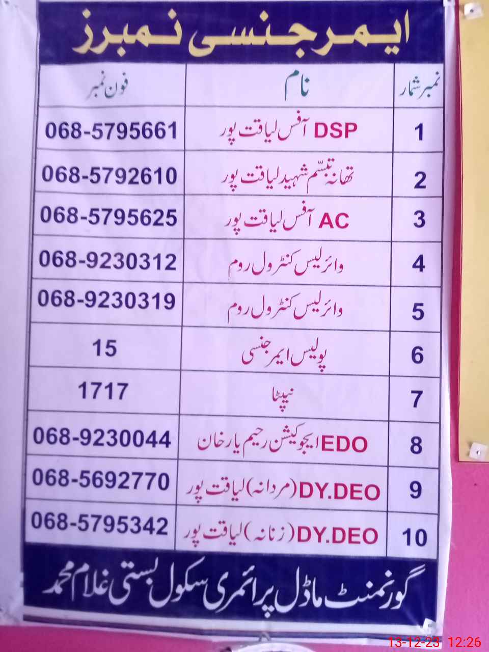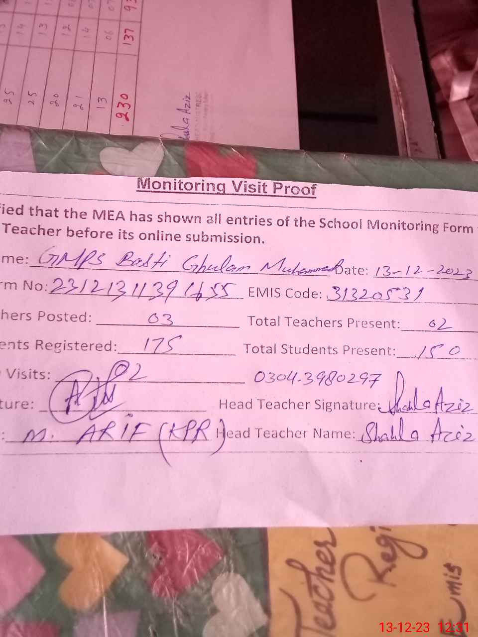 | Name: Sh**** Az**** Designation: (School Headmaster's/Headmistress's) PST Phone/Cell Number: 03**** |