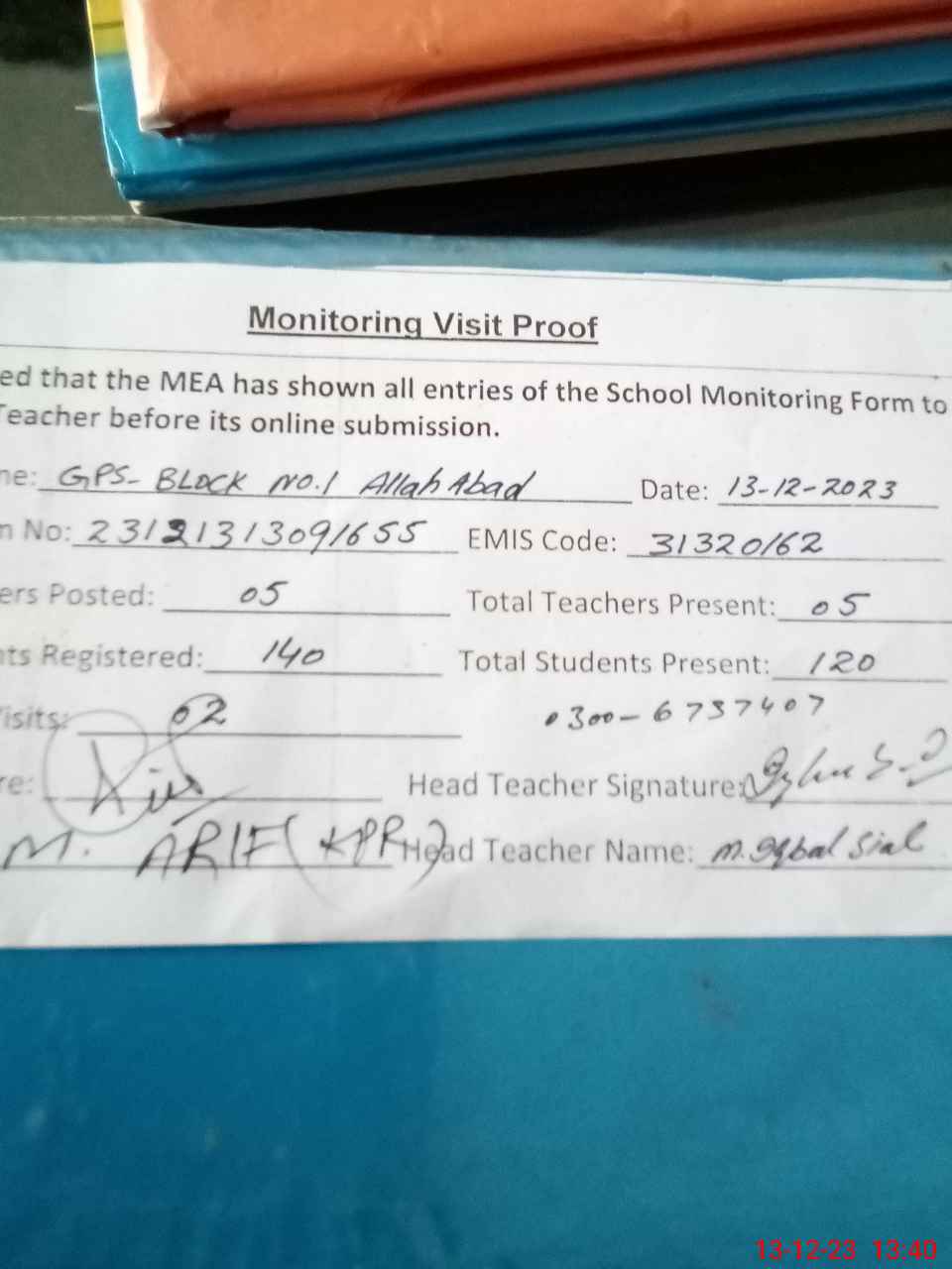 | EMIS Code: 31320162 | Name of School: GPS BLOCK NO. 1 ALLAH ABAD | |||