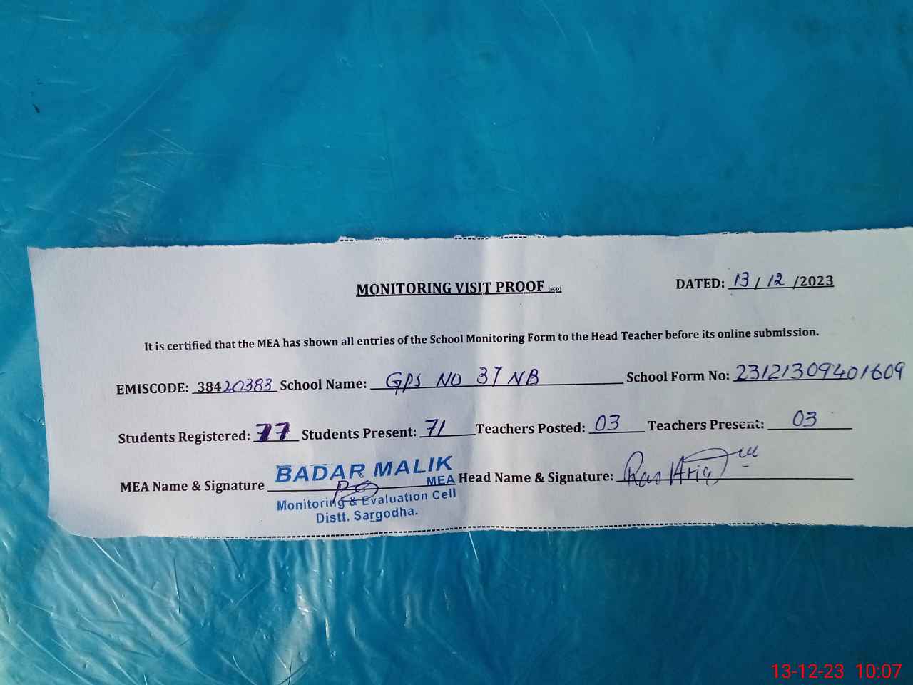 | Attendance Register | Head Teacher | MEA with School | Visit Proof |
