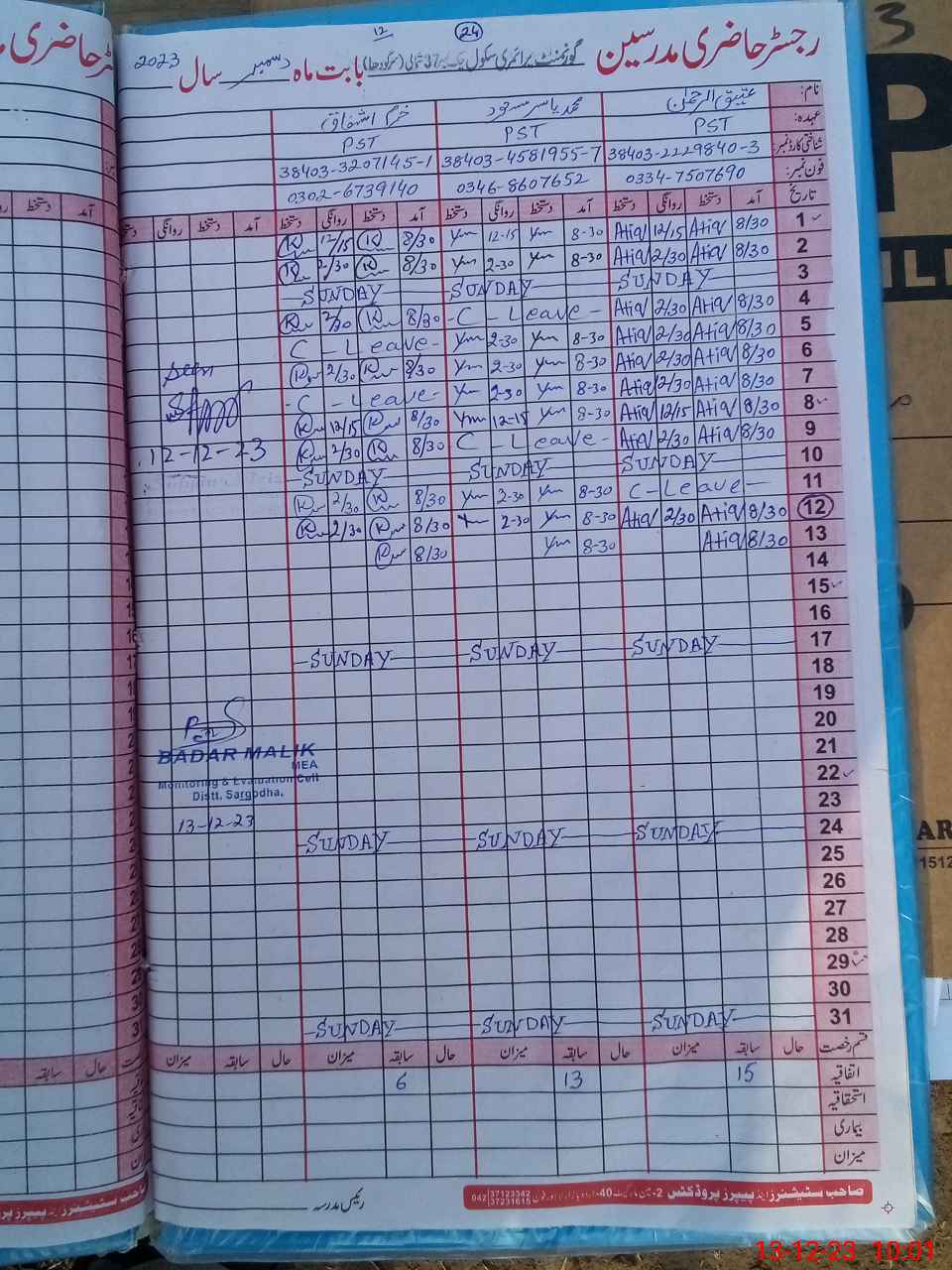 | Name: AT**** URRE**** Designation: (School Headmaster's/Headmistress's) PST Phone/Cell Number: 03**** 75**** |