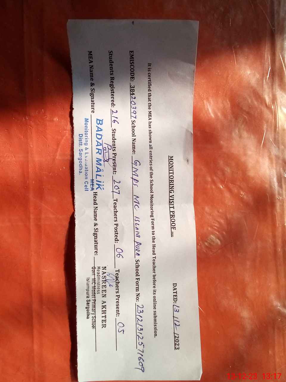 | EMIS Code: 38420397 | Name of School: GMPS MC ISLAM PURA SARGODHA | |||