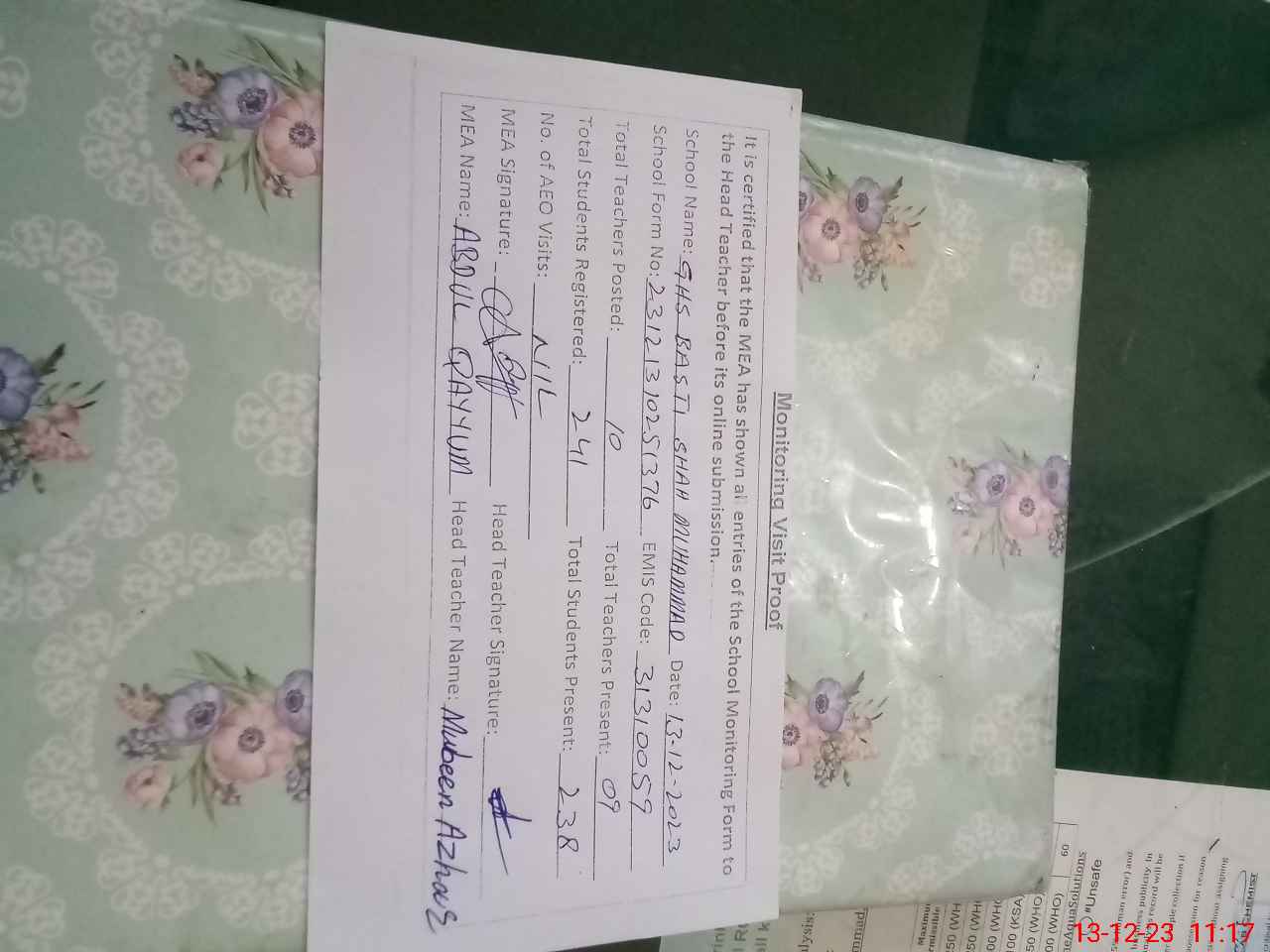 | Certified that this School was Inspected by the Undersigned MEA/DMO Today and the Information Stated Above is as Per Record. | |||||