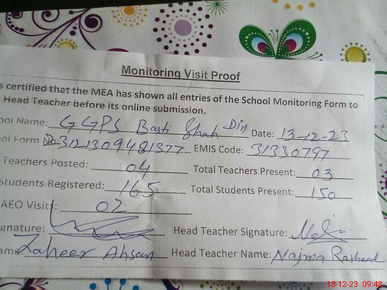 | Monitoring Date: 13-12-2023 | Start Time: 13-12-2023 09:00 AM | End Time: 13-12-2023 09:51 AM | Name of MEA: Za**** Ah**** | |