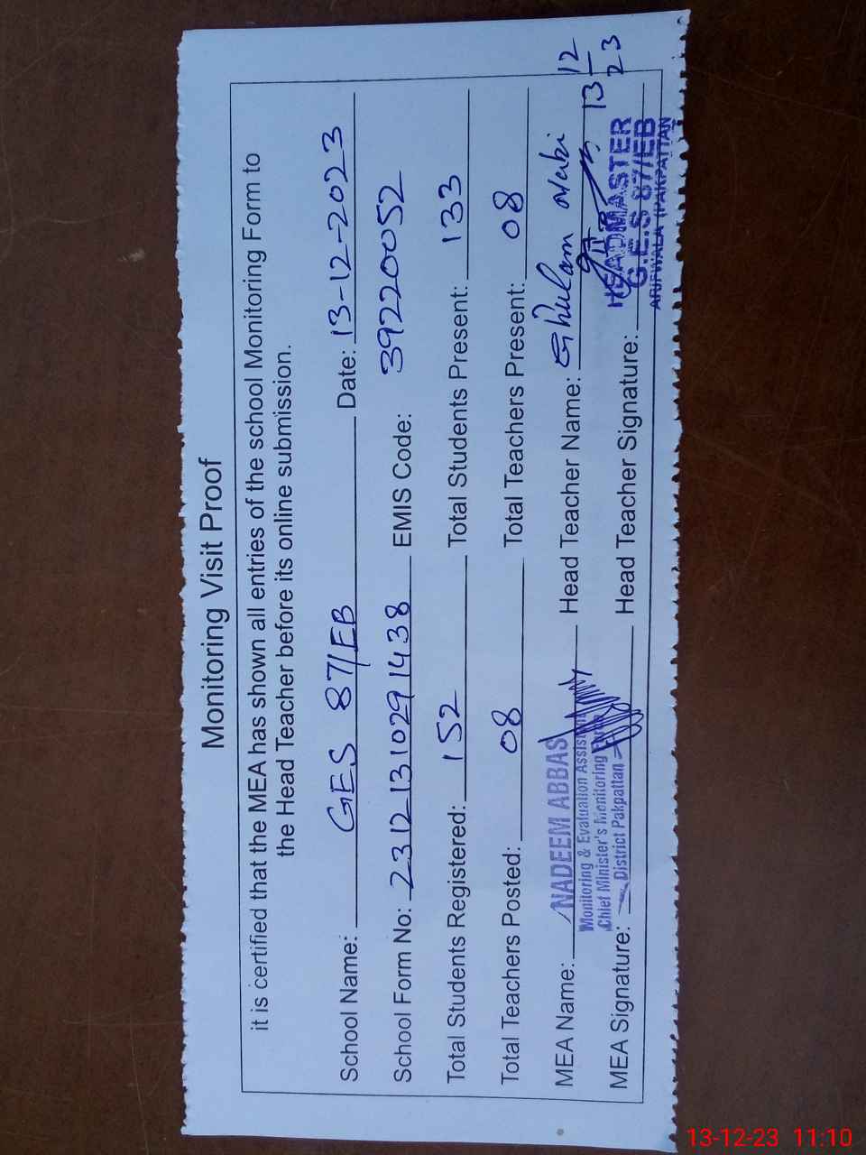 | EMIS Code: 39220052 | Name of School: GES 87 EB ARIFWALA | |||