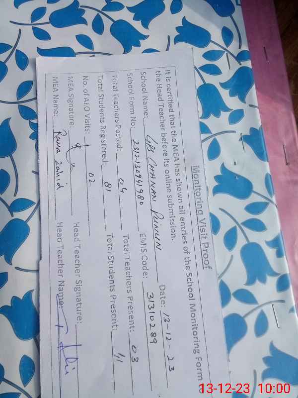 | EMIS Code: 31310289 | Name of School: GPS CHANAN PUNANN | |||