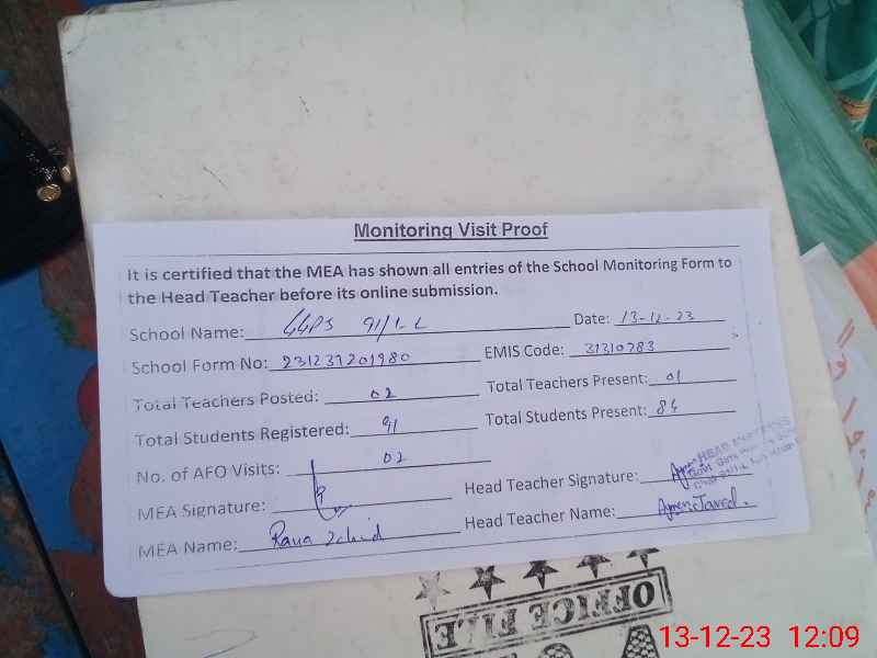| EMIS Code: 31310783 | Name of School: GGPS CHAK NO 91/1-L | |||