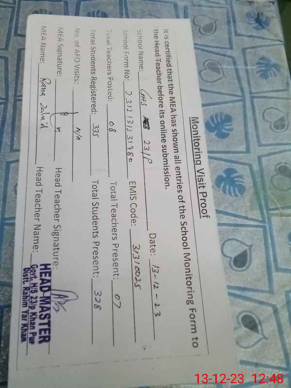 | EMIS Code: 31310025 | Name of School: GHS CHAK NO. 23/P | |||